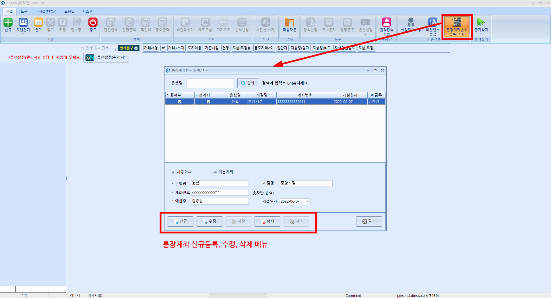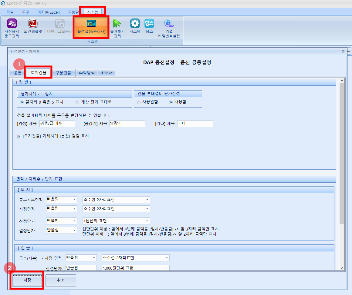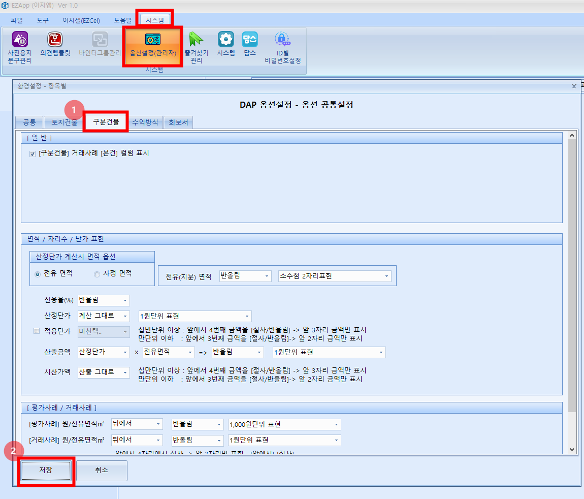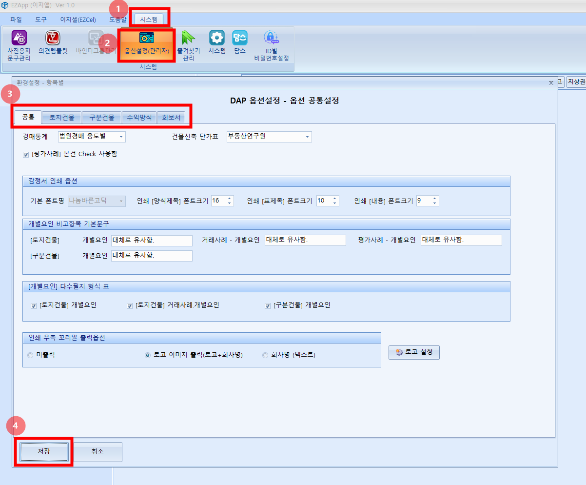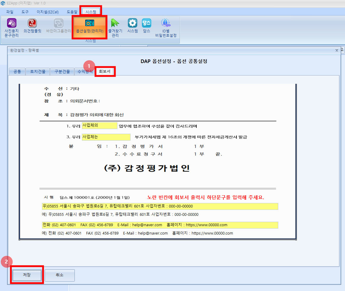 - 옵션설정(관리자)기본값 : 신규 감정서번호 작성시 적용되는 기본정보를 설정