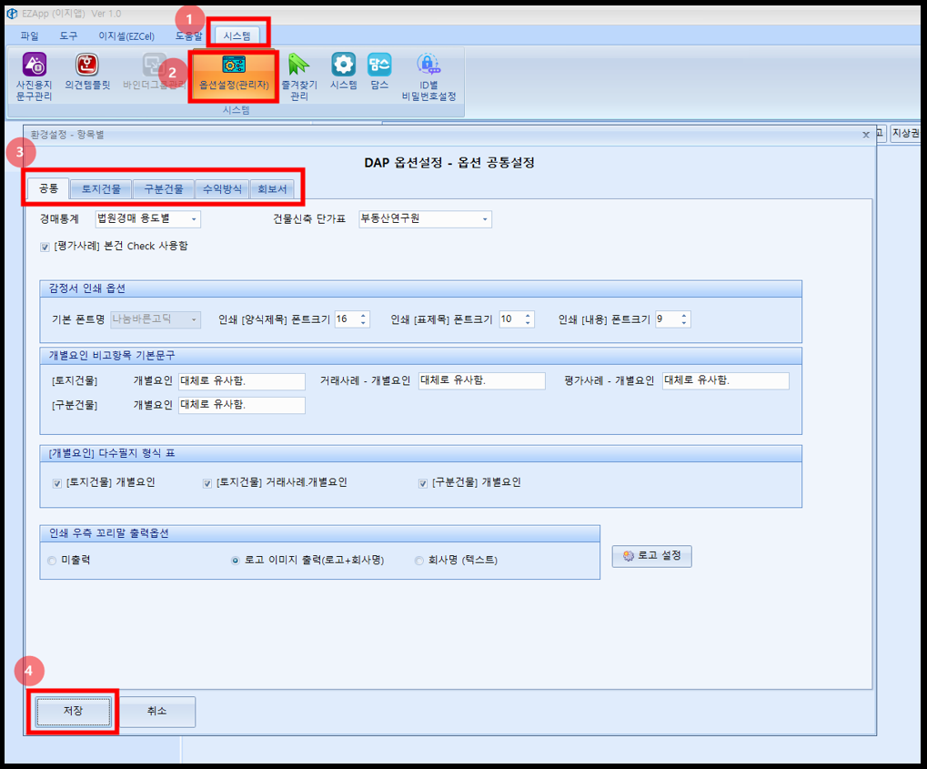 1-3. 옵션설정 : 감정서작성 기본설정 정보