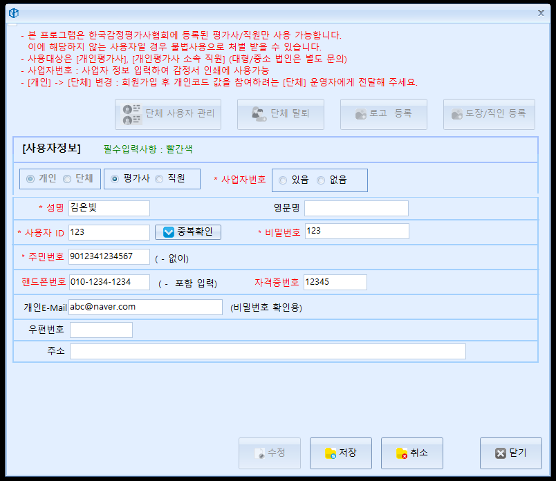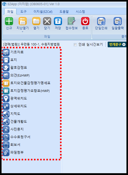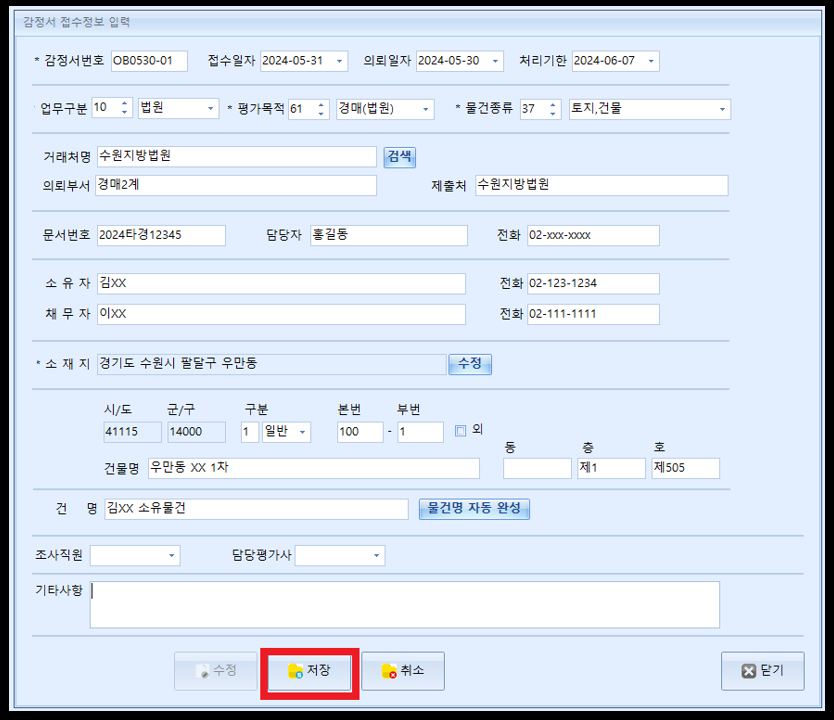 - 감정서번호, 대상물건 소재지, 의뢰처 정보 등 입력